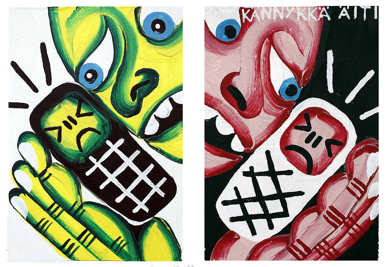 Kännykkä-äiti, 2014, akryyli paperille, 30 x 20cm, 2 kpl